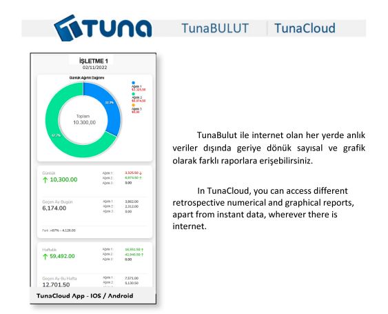 - TunaBulut ile internet olan her yerde anlık veriler dışında geriye dönük sayısal ve grafik olarak farklı raporlara erişebilirsiniz.